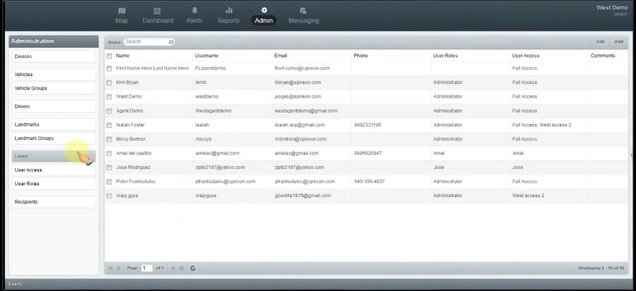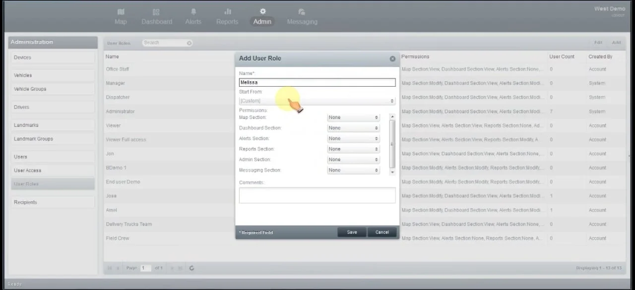 Admin = setup Landmarks, Groups and assign Drivers to vehicles